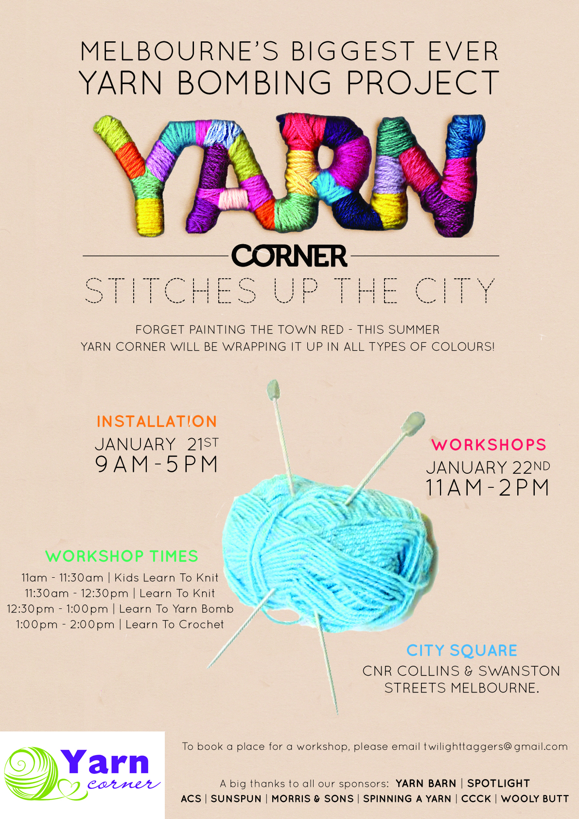Who doesn’t love a good yarn with friends? It’s surely one of the great pleasures in life. So just think what a whole city square full of yarn and potential friends would be like. Fabulous, no? And then what if there were workshops with crafty people showing you how to knit and crochet that yarn into something spectacular? Too good to be true, you say? Well, if you’re in Melbourne on the weekend of January 21 and 22, you can head to City Square to see for yourself. The square will be yarn bombed (think trees covered in granny squares and other knitted and crocheted sweetness) on the 21st and experts will be on hand on the 22nd to talk about their yen for yarn and to demonstrate just how to whip something up out of wool. If you can’t make it that weekend, the tree-cosies will be up until the end of February. What a purl of an idea!