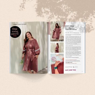 And, of course, there’s a new sewing pattern – meet the Daisy Dress! Created with support from our pals at Potter & Co and Sew Your Way, this flowy, blousy dress offers a bounty of fun features and custom styling options. Raglan sleeves promise fullness and fabulousness, topped off by the optional insertion of lace or trim (swoon!). Designed with lots of ease (with a tie belt to cinch), a button placket down the front, pockets and a band collar, the Daisy can be easily shortened or lengthened to suit your whims or weather. The digital pattern for the Daisy is free with Issue 64!