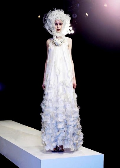 Akira personally led each model out, making sure they were presented precisely as he had envisioned. He mentioned thinking of “paradise” while designing his latest collection, and while this might sound like quite an ambitious theme, he gracefully succeeded in its execution. Three distinct collections were on display, the first being a bridal range. Elegant gowns were intricately adorned with embroidery and applique scattered in floral and whispy skyscapes. Cloud-like contorted fabric floated as headpieces, framing the models’ faces.
