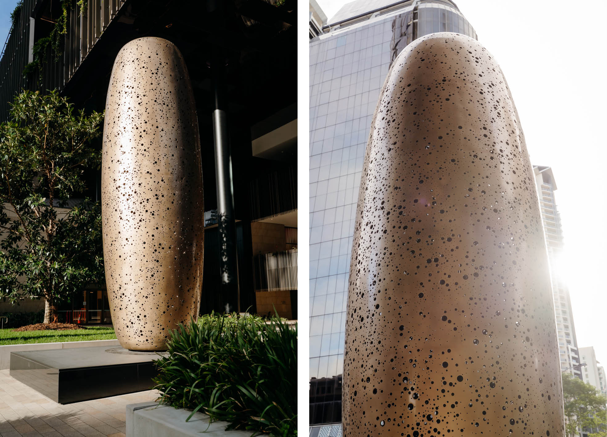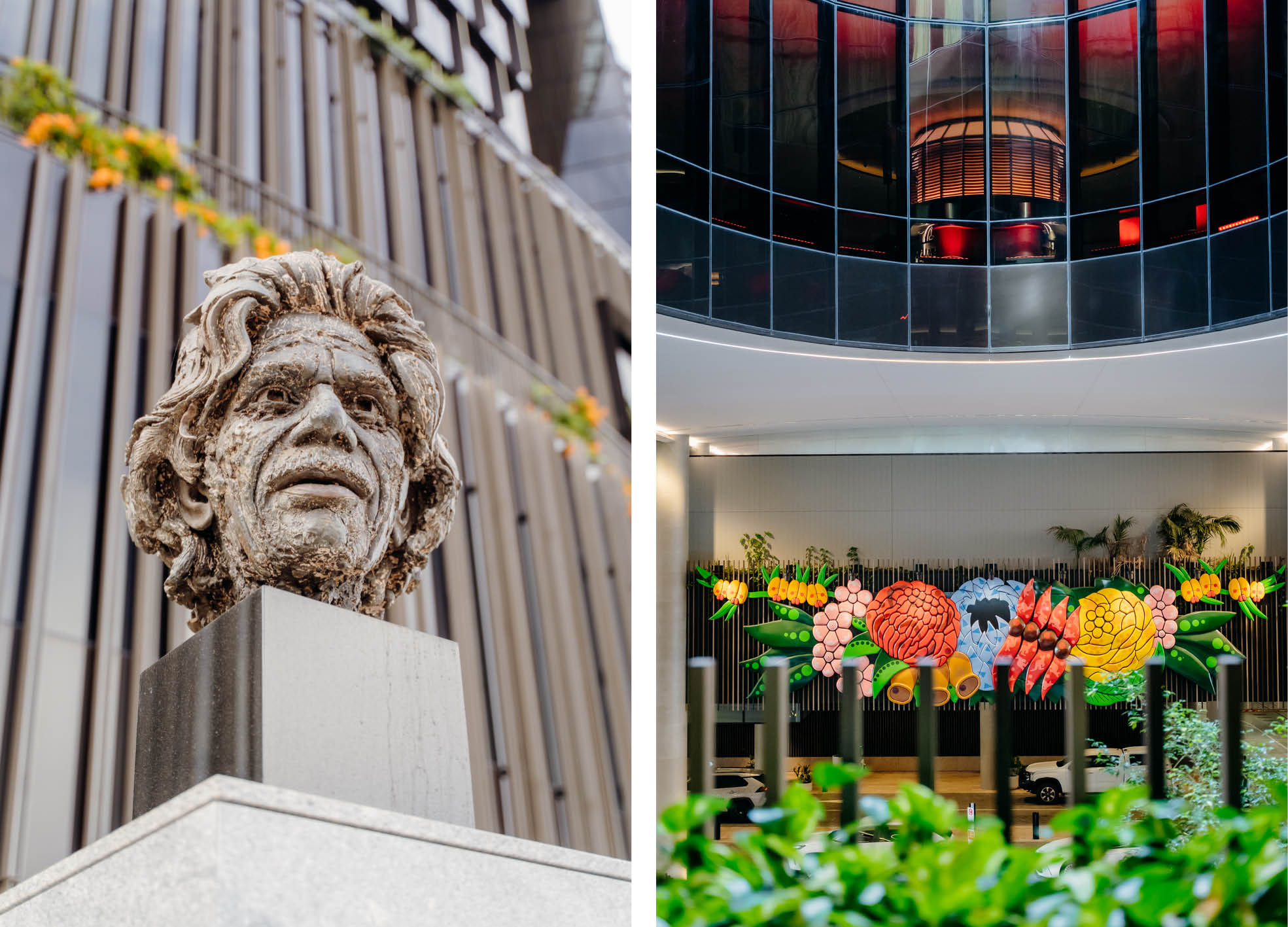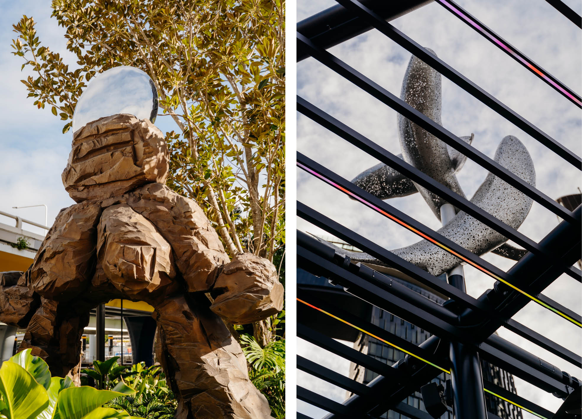 It was a lovely way to explore my own backyard and learn more about the history of the Meanjin lands that I live on. The spectacular artworks that now dot the revived public walkways invite you to experience the area with fresh eyes. The short (and accessible) wander around the iconic site had us taking in Lindy Lee’s star-spangled Being Swallowed by the Milky Way, Justene Williams’ gigantic four-breasted Sheila, the aluminium baking tray figure Looking Up by Tom Friedman and contemporary Indigenous artist Tony Albert’s botanical creation Inhabitant, amongst many other important works. “Brisbane is a part of my heart, and I am so grateful to have been able to work with the local community to present this work,” Tony Albert says of the piece. “It is wonderful to see a growing number of Indigenous indicators in public spaces. We need aspirations for our First Nations children to be visibly seen as a part of our landscape.”