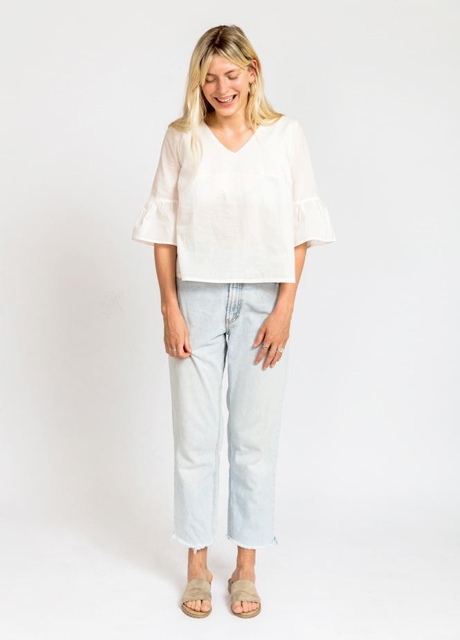 The Peppermint Ruffle Sleeve Top is a simple woven shirt with a v-neck, bust darts, elbow length sleeve with a ruffle and a neck facing. It has a boxy fit and is the perfect piece to take you from day to night. It slips over the head – no fussy closures! The instructions guide you through making the top with french seams for a clean and professional finish. This exclusive Peppermint pattern was created for us by In The Folds.