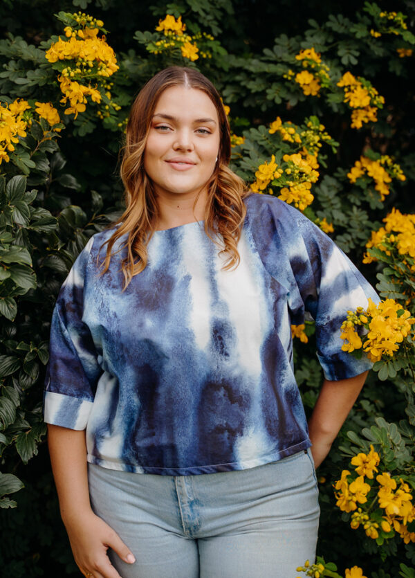 The Tansey is our very first official ‘Peppermint Pattern’ and to bring our vision to life, we worked with renowned fashion educator, designer and consultant Thuy Nguyen of Fashion360. Based in Brisbane, Thuy has worked with major Australian labels and is known for her considered approach to body shapes and immaculate detail. As for fabric, we chose Spoonflower’s Cotton Poplin in the most heavenly print, Watercolor Abstract Indigo Sky, by Amber Gibbs – a surface pattern designer based in Portland, Oregon.