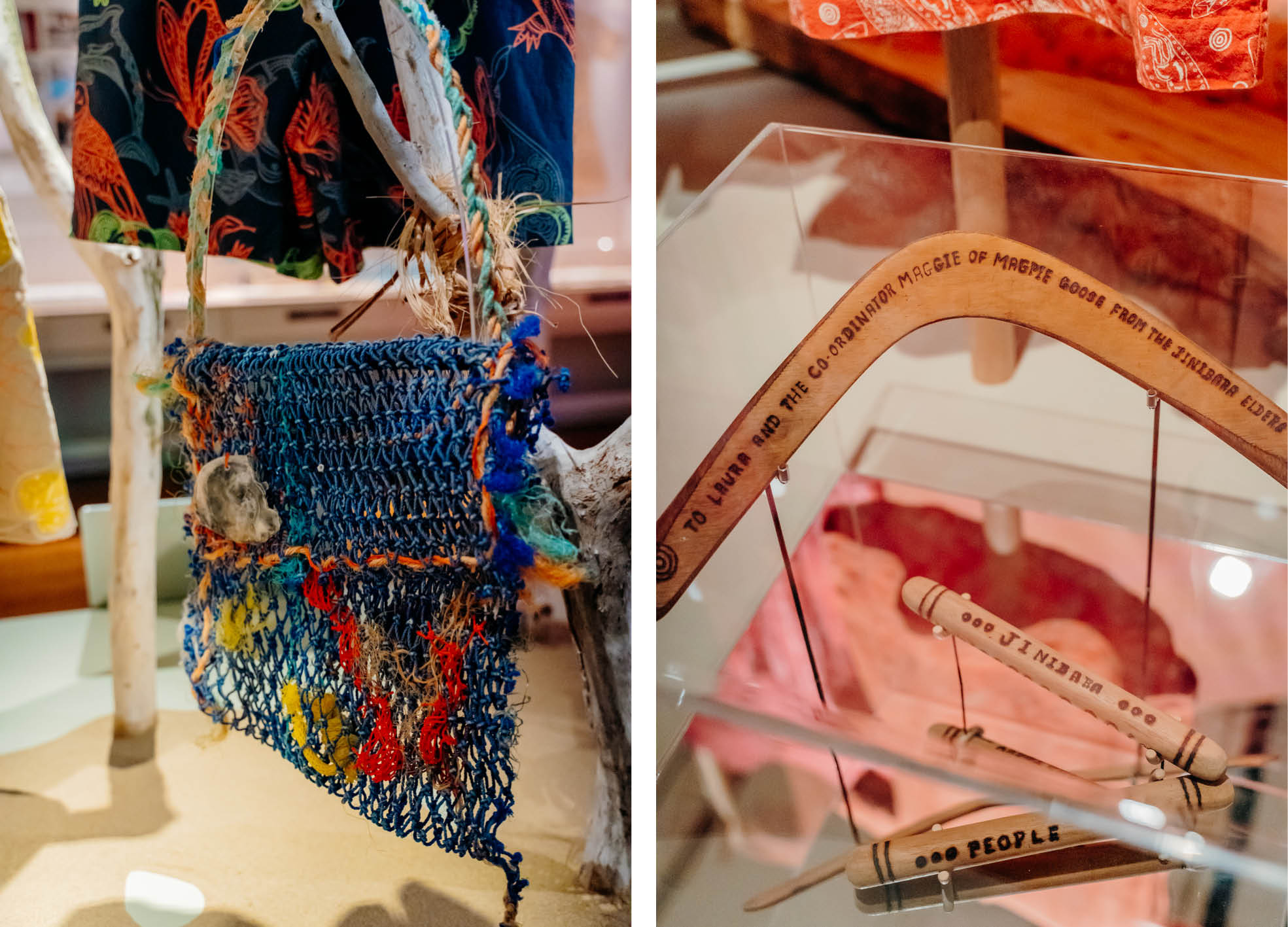 TOP LEFT: (L) NISA YAM RICHY, CO-CURATOR & MAGPIE GOOSE STORE MANAGER), (R) AMANDA HAYMAN, ABOVE: SONJA CARMICHAEL (QUANDAMOOKA ARTIST) AND TROY CASEY